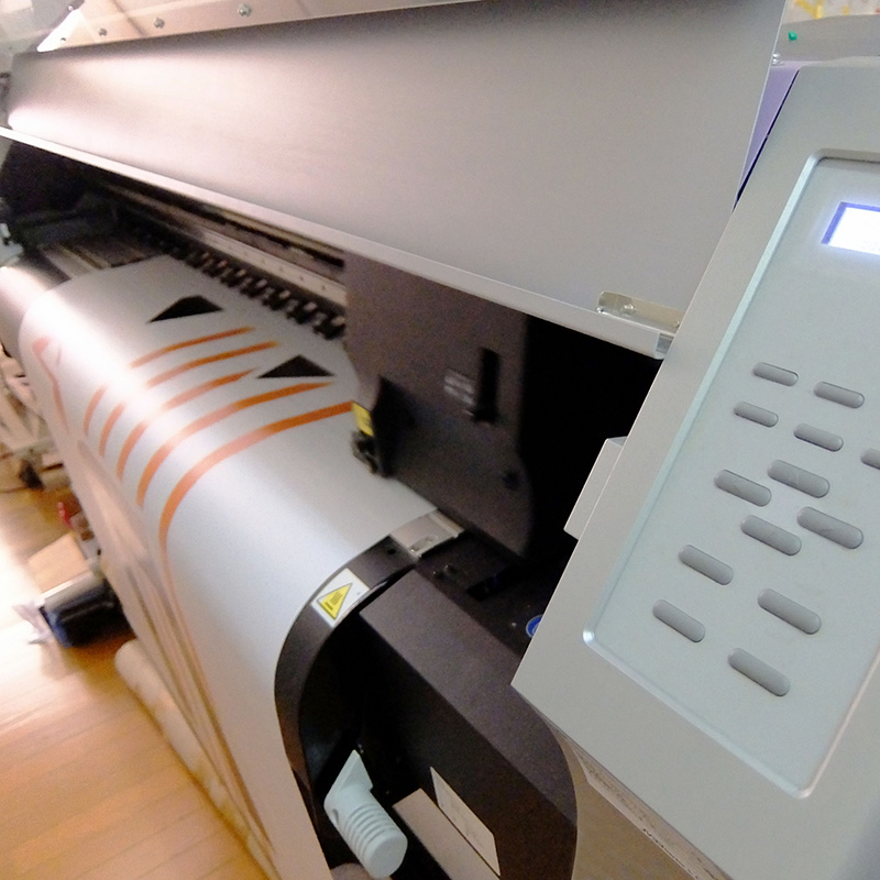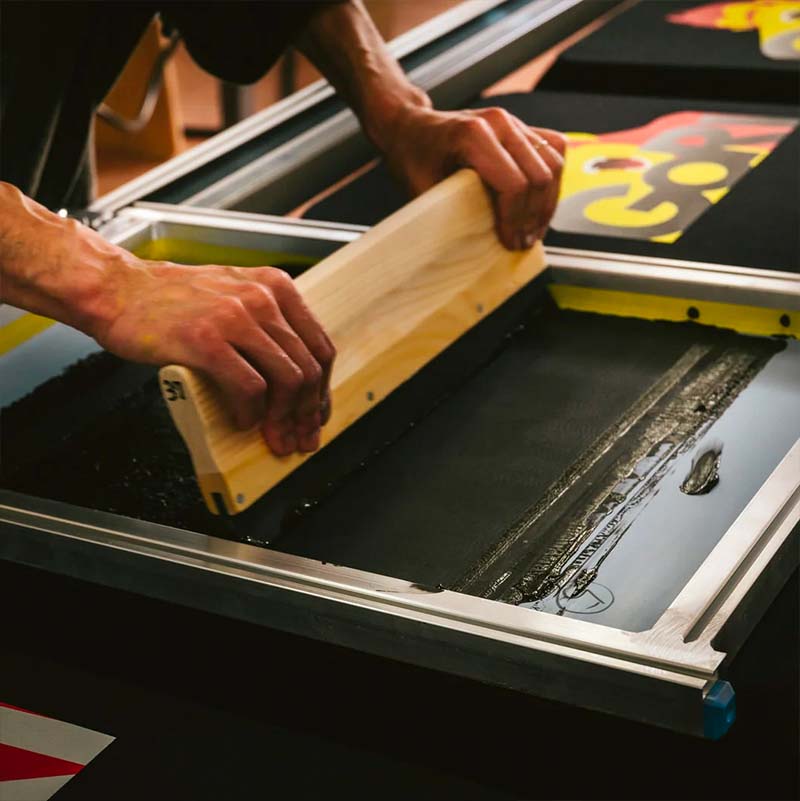 メッシュを使った孔版画の技法で、色ごとの版下を作成して専用のインクをプリントします。